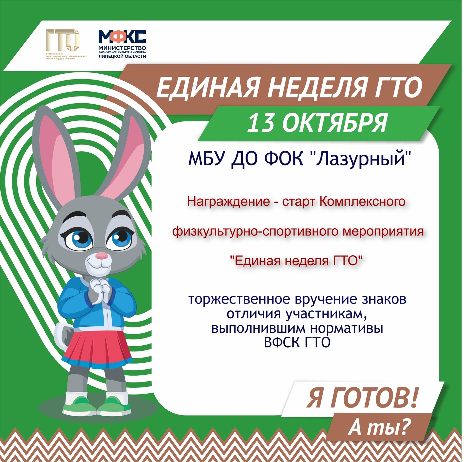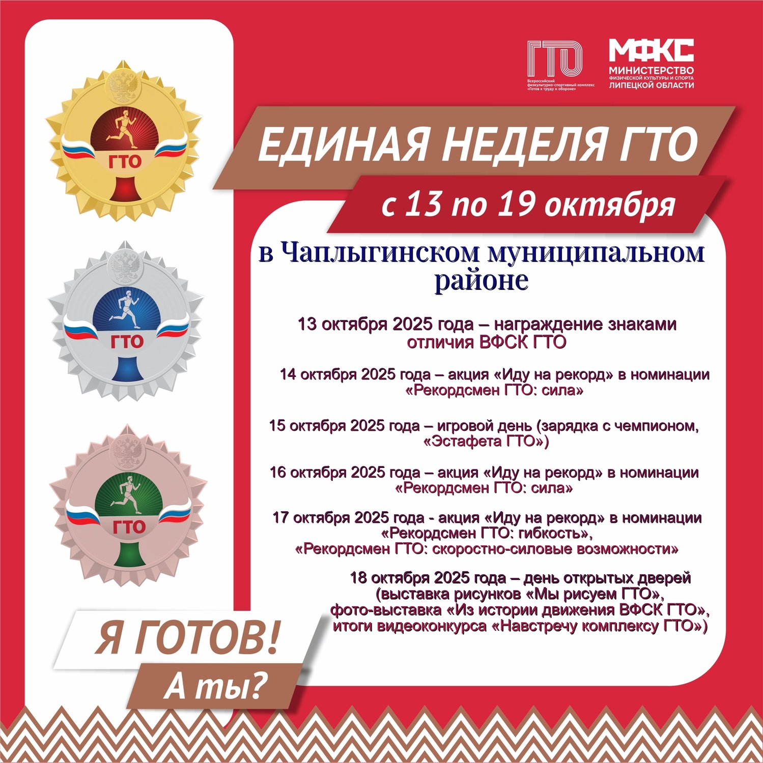 13 октября стартует Комплексное физкультурно-спортивное мероприятие "Единая неделя ГТО". В этот день состоится торжественное награждение знаками отличия ВФСК ГТО.